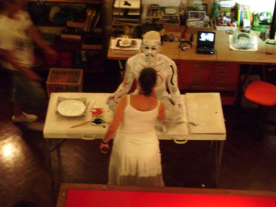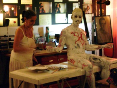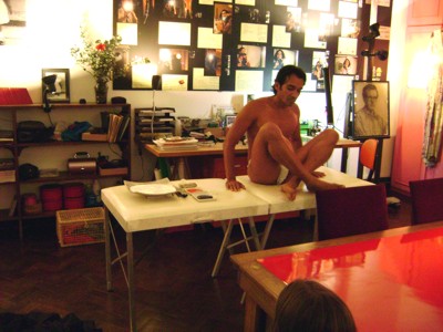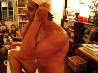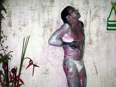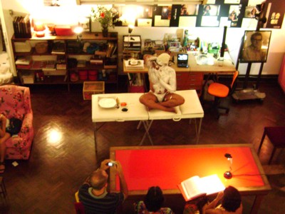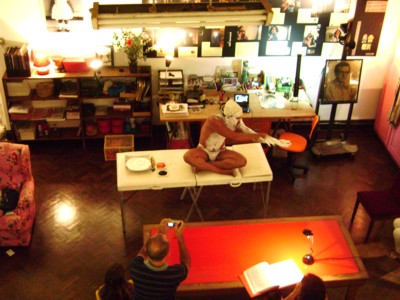 Uma tela em branco, à disposição da imaginação do público. O artista visual Wagner Lacerda apresentou na última sexta-feira (15) a performance Diário de Passagem, utilizando o próprio corpo como extensão da sua arte. A apresentação, segunda realizada na exposição intervenção doméstica, da videomaker Mônica Simões, integra a programação de pocket shows que acontecerão até o dia 12 de fevereiro, de quinta à sabado, dentro da casa atelier da artista, reunindo artista dos mais diversos segmentos.